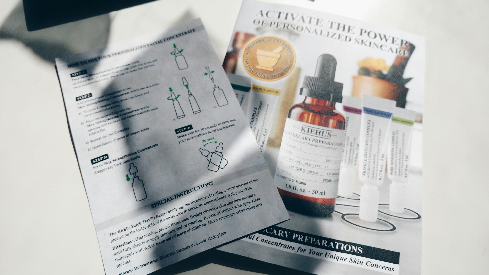 The apothecary preparations also includes a bottle with a print-out that includes your name, and unique codes tied to your preparation (for re-ordering, online), as well as a print out listing your concerns, with instructions on mixing the preparation, on the back.